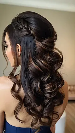 So, your bestie’s getting hitched, and you’re rocking the bridesmaid gig. Let’s be real, nobody wants to look like they tried TOO hard, but you definitely don’t want to fade into the background with a basic ponytail. This hairstyle is like the perfect middle ground! It’s got some fancy braid action up top, which is super cute, and then it flows into these beautiful, bouncy curls that are just begging to be Instagrammed. Plus, the flower detail? Chef’s kiss!