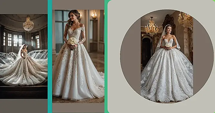Thinking about ‘dream wedding dresses’ often brings images of gowns that are, well, pretty extra! This one in the photo looks like it could float away on a breeze if it weren’t for the serious amount of fabric. It’s got layers upon layers, lace everywhere, and enough sparkle to compete with a disco ball. Honestly, wearing this might feel like being wrapped in the fanciest, biggest duvet cover ever made, but way more stylish and probably a lot heavier.