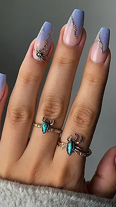 These nails are fierce and fun, with a cool ombre effect and glittery accents that make them totally eye-catching. They’re like a party on your fingertips! But the real star of the show is the adorable tiny scorpion on each nail, making it clear you’re ready to rule the world (or at least your Instagram feed)! Even if you’re not a Scorpio, these nails are sure to make you feel like a confident, powerful queen bee.