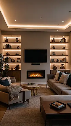 Then there are those amazing shelves flanking the TV, showcasing books and cool knick-knacks, each with its own little spotlight. It’s like a mini museum, but instead of whispering, you can totally blast your favorite tunes while admiring your carefully chosen collection of… well, whatever cool stuff you have! And don’t even get us started on that fireplace. The warm glow from the flames, combined with all the other smart lighting, means you’re not just looking at a room; you’re *experiencing* it. It’s the kind of lighting that makes a board game night epic, a movie marathon super cozy, or even makes your algebra homework feel a little less intimidating. Maybe.