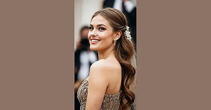 This lady’s got a hairstyle that’s totally worthy of a fancy gala! It’s like a fairytale princess, with those gorgeous waves and sparkly hair clips, and it makes her look so confident and ready for anything. Imagine being the most popular person at the school dance with this look, everyone would be staring in awe! You’d be the one everyone wanted to dance with, and you’d be the one who wins prom queen for sure!