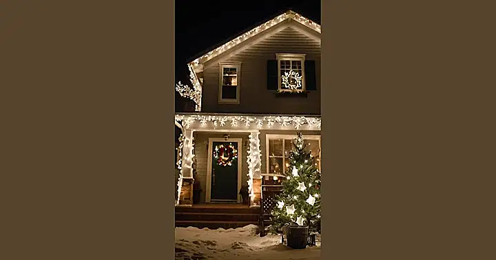 This house looks like it’s straight out of a Christmas movie! Imagine snuggling up inside with hot cocoa, watching the snow fall softly, and seeing all those sparkly outdoor Christmas lights twinkling on the roof and eaves. It’s like someone sprinkled magic dust all over the place, turning a simple house into a winter wonderland. Those lights are definitely brighter than my math test grades, but in a good way!