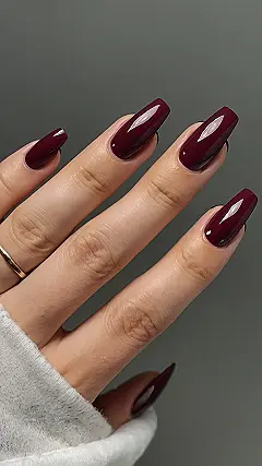 This picture shows some seriously stylish nails, painted in a deep, rich burgundy shade. It’s like the color of a fancy wine you’d sip at a fancy dinner party, but way less messy. You could totally pull off this look, even if you’re just hanging out with your friends at the mall or having a pizza night at home.