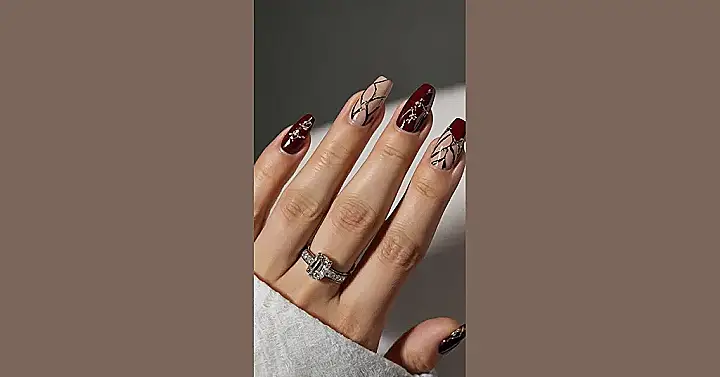 Check out the awesome design on these nails! The deep red and soft beige colors are super chic, and the swirly lines with tiny sparkly bits? They look like little fancy branches or maybe constellations just chilling on your fingertips. These aren’t your average nails; they’re like mini pieces of art ready to go on holiday with you. They’re fancy enough for a nice dinner selfie but still chill enough to just admire while you’re relaxing by the pool (or your couch, hey, staycation counts!).