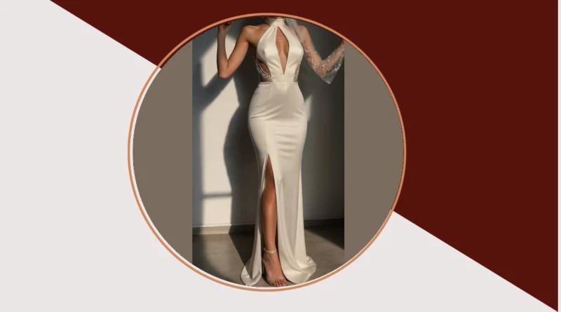 And can we talk about that leg slit? That’s not just a fashion statement; that’s a genius move for navigating tricky dance floors or making a grand exit without tripping over your own fabulousness. Paired with those sparkly heels and the perfect clutch (which probably holds only lip gloss and emergency confetti), this whole look screams confidence and fun. It’s the kind of classy wedding dress that ensures you’ll be comfortable enough to groove to the DJ’s playlist while still looking like you just stepped off a magazine cover!