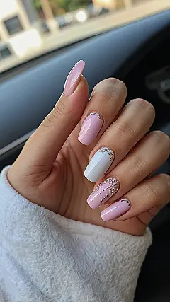 If you thought pink was all these nails had going on, think again! Some of them decided to go full glam with fancy gold swirls that look like they belong in a fairy tale, plus tiny sparkly jewels. It’s like having mini crowns on your fingertips! These are perfect for catching the light when you’re holding that ice cream cone or showing off your latest friendship bracelet. Who needs a magic wand when your nails are this sparkly and awesome?