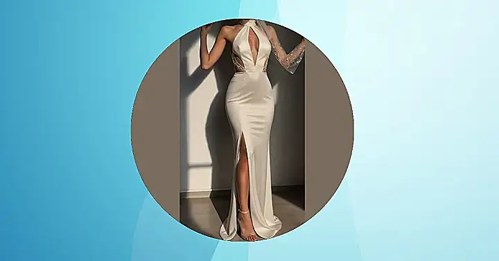 Look closer and you’ll spot some seriously fun details, like the sparkling cutouts on the side that basically say, ‘Yes, I’ve been doing my sit-ups!’ And did you notice the cool one-sleeve situation? It’s like a fashion-forward secret, making sure one arm is ready for a dramatic wave while the other is perfectly chic. Then there’s that high leg slit, practically designed for showing off those awesome heels and making every step down the aisle look like a strut on a red carpet. This dress isn’t just about looking classy; it’s about looking amazing while also having a blast and maybe even a few laughs.