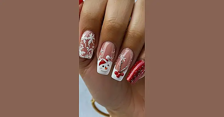 These nails are seriously festive! Imagine tiny snowmen and sparkly red accents all decked out for Christmas on your fingertips. It’s like wearing a miniature winter wonderland, except way cooler because you can actually *do things* with your hands (unlike those snowmen who mostly just stand around looking cute). Plus, who needs a Christmas sweater when you’ve got this much holiday cheer on your nails?