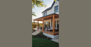 This small house design exterior is seriously stylish! Look at that sleek, modern look – all dark wood and cool grey, it’s like something out of a movie. It’s proof that even small spaces can have a huge personality, and that “small” doesn’t have to mean “boring.” Imagine having dinner on that balcony at sunset; with all the warm lighting, it would be absolutely magical!