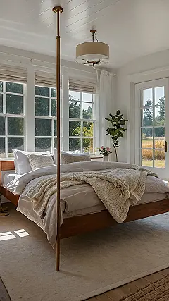 This bedroom is like stepping into a warm hug on a cold winter day. With its soft, neutral tones and comfy-looking bed, you could easily spend all day lounging in here. The big windows let in lots of light, making the room feel even more inviting. Plus, the unique arched window adds a touch of elegance that makes the room feel extra special.