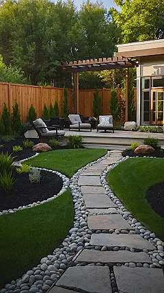 This backyard is a total zen zone! Imagine chilling on those comfy chairs, soaking up the sun, and enjoying the peace and quiet. The walkway is super cool too! It’s like stepping on giant, flat pebbles, and the little rocks around the edges make it feel like you’re walking through a mini-river.