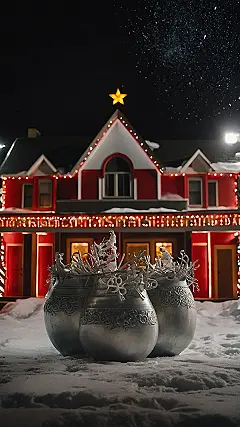 Imagine this: it’s Christmas in Canada, the snow’s falling, and a brightly lit red house – decked out like a Christmas card – is the backdrop to the most unexpected scene. Three giant, silver pots, looking like something straight out of a fairytale (or maybe a really festive soup kitchen!), sit nestled in the snow. They’re adorned with sparkly bits and bobs, almost like they’re trying to outshine the house’s dazzling Christmas lights. It’s a little bit magical, a little bit quirky, and totally Canadian in its charmingly unexpected way!