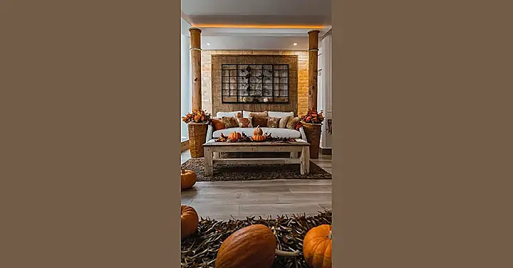 This picture shows a living room all decked out for autumn! You can tell it’s fall because of the pumpkins and the orangey-brown leaves everywhere. It looks like someone’s ready for a cozy autumn party, with comfy couches, cozy pillows, and pumpkins galore! The pumpkins look so happy and welcoming. They’re like, “Come on in and relax! We’ve got plenty of space for everyone.”