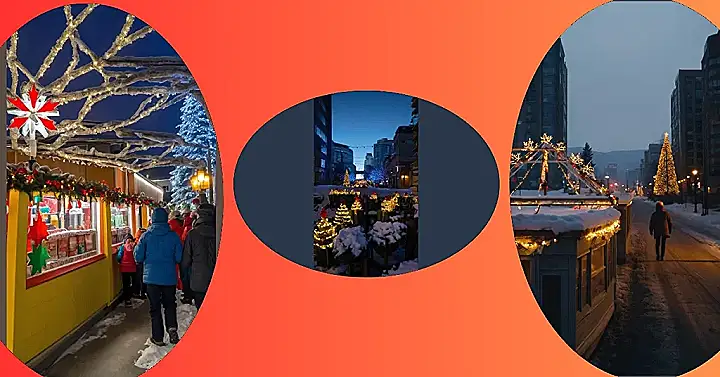 Picture this: You’re bundled up in your warmest toque, the air nips at your nose, but your heart’s all warm and fuzzy because it’s Christmas in Canada! This magical image shows a totally adorable Christmas market, all decked out in festive lights and twinkling decorations. There’s even a giant maple leaf, because, hey, we’re Canadian! It looks like the perfect place to grab some hot chocolate and maybe a beaver-shaped gingerbread cookie (just kidding… unless?). People are lined up, probably dreaming of poutine and presents. It’s a cozy winter wonderland, just the kind you’d find in a classic Canadian Christmas movie.
