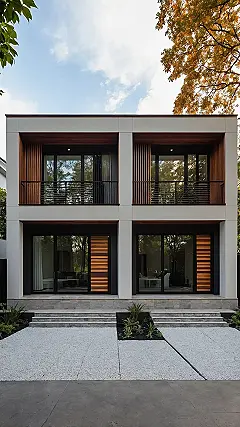 Step aside, old-fashioned bungalows, because this modern 2-story house just rolled up looking like it owns the neighborhood! With its super clean lines and those cool black-framed windows, this place is basically a giant, stylish Rubik’s Cube you actually want to live in. Those big glass doors on the ground floor? Perfect for spying on squirrels or staging an epic board game tournament without anyone feeling cramped. Plus, the second floor boasts balconies that are practically begging for a sunset selfie session or some dramatic movie-watching with popcorn, no parents allowed (we can dream!).