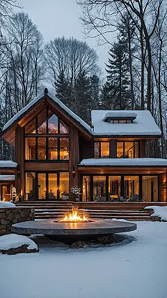 While the outside is frosty and sparkling, this cozy palace is practically screaming “come on in, the hot chocolate’s ready!” That amazing fire pit in the snow looks like the perfect spot to toast marshmallows and tell ghost stories, completely ignoring the fact that you’re surrounded by actual tall trees. You could sit out there feeling all warm and fuzzy, while the winter air gives your cheeks a nice, rosy glow. Honestly, living here, you might even start to *like* shoveling snow, just for the thrill of coming back to this super warm and luxurious pad.