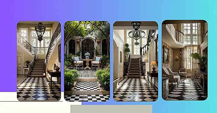 This place looks like someone took all the cool bits from a fancy Southern mansion and shrunk it down to pocket size! Think of it: a secret garden, perfect for chilling with a sweet tea and a good book. The black and white checkerboard floor makes it feel like you’re stepping into a giant game of chess. Just don’t let the potted plants get any funny ideas and start moving themselves around – that would be a seriously weird afternoon.