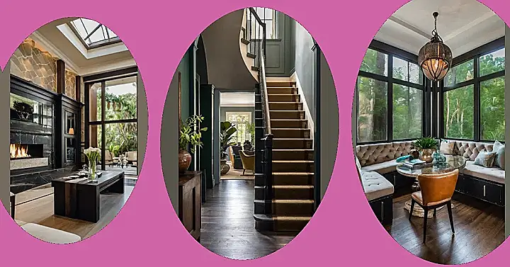 This interior is so fancy, it’s practically wearing a monocle and sipping sweet tea! But seriously, picture this: a southern grandma with a knack for redecorating and a love for a little bit of everything. You’ve got the comfy chairs for gossiping, a staircase that practically demands you make a grand entrance, and a plant that looks like it’s plotting to take over the world. It’s like a design explosion, but in a totally comfy, ‘come on in and stay a while’ kinda way.