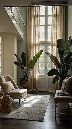 This room is so chill, it’s practically wearing a seersucker suit and sipping sweet tea. Those leafy plants are totally rocking the “I’m on vacation” vibe, like they’re about to ask you if you brought enough sunscreen. The whole space is screaming “relax,” and honestly, who are we to argue with that? Just try not to trip over a fern while you’re heading for that super inviting armchair.