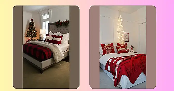 **Paragraph 1:** Whoa, check out this bedroom! It’s like Santa’s workshop threw a pajama party with a super comfy bed. That red and black plaid blanket is seriously begging for a snuggle session, and the fluffy white throw? Pure winter wonderland vibes! Even the headboard’s got a festive garland – talk about Christmas spirit overload! And the tiny Christmas tree? It’s the perfect size for a cozy room, not too big to overwhelm the space. Seriously, this room is holiday goals!