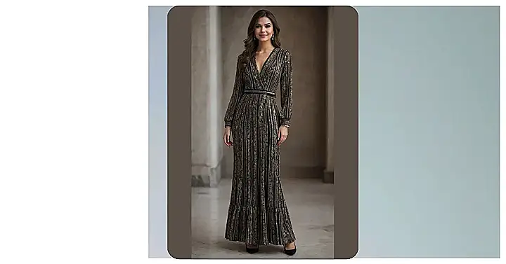 What makes this look perfect for your New Year’s Eve outfit ideas for 2025? Well, beyond the obvious glamour, notice those awesome long sleeves! They’re like a built-in force field against chilly party venues, meaning you won’t have to awkwardly borrow your friend’s hoodie five minutes before the ball drops. The flowing, layered skirt also means you can totally sneak in an extra slice of pizza (or two!) without anyone noticing, which is a major win in our book. So, ditch the struggle of finding something that’s both fancy and functional, and let this elegant number inspire your dazzling entrance into 2025!