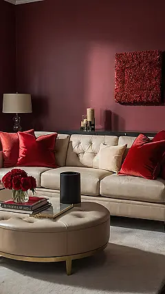 Wow, check out this room! That deep red paint is like stepping into a juicy cherry, and the fancy swirls on the wall are way cooler than your average wallpaper. Those red pillows on the cream-colored couch? They’re like perfectly placed exclamation points, shouting “Cozy!” from the rooftops. It’s all so sophisticated, yet super comfy—imagine sinking into that sofa with a good book and a cup of hot chocolate. This red room decor is definitely a winner!