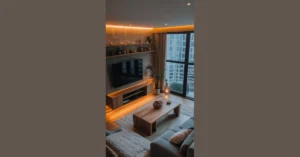 The red walls aren’t just a bold choice; they’re a statement! They make the creamy ottoman and the slightly less-creamy couch look even more inviting. The artwork is wild – it’s like abstract art decided to have a dance-off with geometry, and everyone’s invited to the party. You can almost feel the relaxed vibes; it’s the perfect spot for chilling out with friends, doing homework, or just soaking in the stylish energy. Who knew red could be so calming?