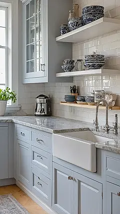 See those cool floating shelves with the perfect blue and white bowls? They’re so artfully arranged, you almost expect them to have their own velvet ropes. You just know these aren’t for holding your soggy cereal; they’re for looking fabulous! And that massive farmer’s sink? It’s ready for some serious dish duty after a big family meal, or maybe just to perfectly hold your single mug of hot chocolate. The shiny subway tiles probably make cleanup a breeze, meaning fewer arguments about who’s on dish patrol – or maybe just clearer evidence if you skip your turn!