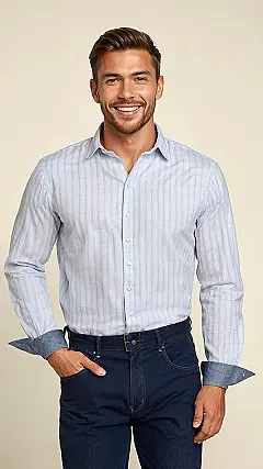 The guy in the picture clearly knows a thing or two about rocking a shirt outfit! His light blue striped shirt isn’t just a piece of clothing; it’s practically giving us a fun lesson in looking effortlessly cool. Notice how he’s got those cuffs rolled up? That’s not just for showing off his watch, it’s a secret signal that says, “I’m chill, but I still put thought into this.” It’s like his shirt is winking at you, saying, “Yeah, I look good, and I know it!”