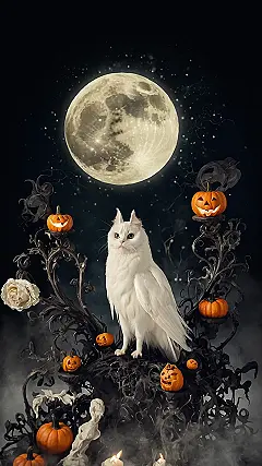 Step into a scene straight out of a Halloween dream where a giant, glowing full moon lights up the starry night sky. Perched majestically on twisted, shadowy branches sits the most stunning white cat you’ve ever seen. With eyes like molten gold, this fluffy guardian looks like it’s supervising all the spooky fun, surrounded by grinning jack-o’-lanterns and mysterious swirling fog. It’s an enchanting blend of creepy and charming, perfectly capturing that special Halloween vibe.