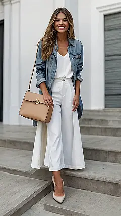 So, you want to rock a spring outfit that screams “I’m ready for sunshine!” This look is like the perfect mashup of comfy and chic. It’s got the chill vibes of a denim jacket paired with a simple white top, but then BAM! Check out those wide-leg pants and cute heels. It’s comfy enough to chill with friends, but classy enough that you can impress your relatives with your sense of style.