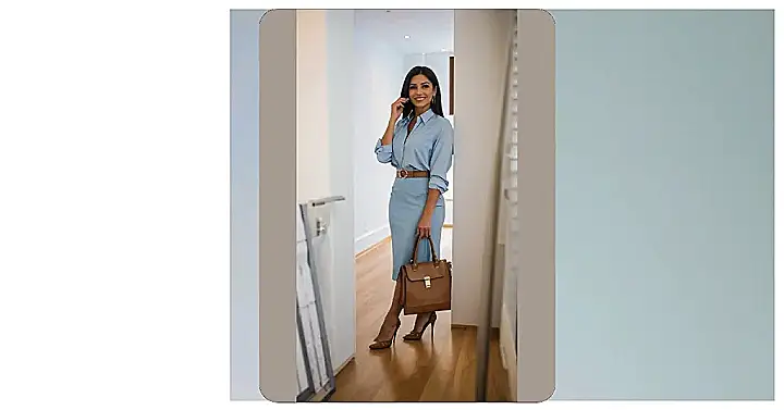 Think of this outfit as your secret weapon for dominating that presentation or acing that interview! The sleek skirt and perfectly tucked-in blouse say, “I’m professional and ready to work,” while the pop of color from the purse and belt screams, “But I also know how to have fun!”. Basically, you’ll be giving off major boss vibes all day long.