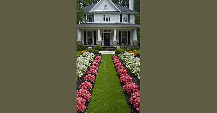 This picture is like a colorful party for your feet! It’s got these awesome flower beds, and they’re all lined up like a rainbow in front of a house. You can almost imagine yourself walking along the stone path, feeling the soft petals brush your ankles as you go.