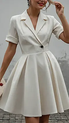 This dress is like if a super serious blazer decided to go to a party and had the best time of its life! Look at that crisp, elegant cream color – it practically shouts “I’ve got my life together (even if I’m still trying to figure out what I want for dinner).” With its sharp collar and that perfectly pleated skirt, it’s hitting all the right notes for a chic, classy look. You could wear this to a fancy school presentation and instantly feel like you deserve an A, or maybe even to convince your parents to let you stay up an extra hour. Talk about an outfit that makes you look smart and put-together, even if your brain is still in weekend mode!