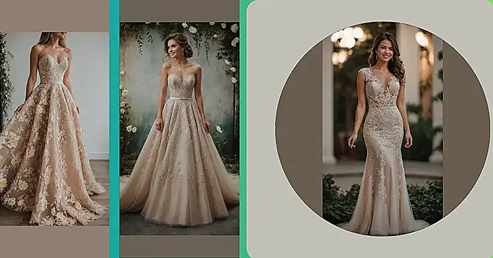 This stunning gown looks like it fell straight out of a fairytale, but with a super cool, modern twist. While it might not be literally woven from gold ingots (which, let’s be real, would be incredibly heavy to dance in!), the beautiful warm tone and intricate details definitely give off major ‘golden hour glow’ vibes. All those delicate flowers and lace make it look like someone carefully stitched a whole blooming garden right onto the fabric – imagine trying to count all the petals! It’s the kind of dress that makes you feel instantly fancy, like you should be sipping sparkling cider and getting ready for the most epic party ever.