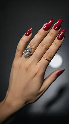 And check out that ring! It’s like a sparkly crown for your finger, and it looks absolutely amazing with the red nails. It’s like a perfect match for your outfit, right? Maybe you’re going to a fancy dinner, or maybe you’re just hanging out with your friends – whatever you’re doing, this look is super chic. You’re definitely rocking that “subtle fall nails” vibe!