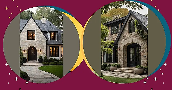 Forget dusty old castles; this house is what happens when medieval charm gets a serious style upgrade! Peep those awesome dark wood beams crisscrossing the light walls – that’s the classic Tudor vibe, saying ‘I’m historic, but also super trendy.’ With its sturdy stone facade, that inviting arched doorway, and a roof that looks like it could withstand a dragon (or at least a really bad storm), it’s got all the fairytale feels without needing a moat. Basically, it’s giving ‘Hogwarts, but make it suburban chic’ – and we are totally here for it!