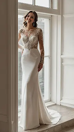Looking for that ‘wow’ moment without feeling like you’re wearing a giant meringue? This dress absolutely nails the modern minimalist brief, and then some! The smooth, sleek skirt is all about elegant simplicity, but don’t think it’s boring – the gorgeous lace bodice and long sleeves add just enough sparkle and sophistication to make heads turn. It’s like the perfect glow-up: effortless, chic, and definitely makes you feel like you just stepped off a fashion magazine cover. Plus, that smile from the model? Pure ‘I just won the style lottery’ vibes!