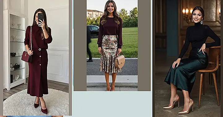 Forget trying to figure out what top goes with what skirt – this holiday party outfit just said, “Why not match absolutely everything?” And honestly, we’re here for it! Rocking a gorgeous burgundy from head to toe, complete with a snazzy skirt, cozy turtleneck, and even matching shoes, this look is basically telling everyone, “Yes, I know I look this good, and no, I didn’t spend all day stressing about it.” It’s the kind of outfit that makes you feel instantly put-together, ready to grab a sparkling cider and maybe even attempt a dance move without tripping.
