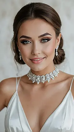 Getting ready for a big day usually involves finding matching socks, but for a bride, it’s all about that perfect, absolutely smudge-proof face! This stunning look proves that bridal makeup isn’t just about looking good; it’s about looking like you could star in your own rom-com, even after a few happy tears. Her dazzling blue eyes, framed by those dreamy lashes and perfectly arched brows, are basically saying, “Yep, I woke up like this… after about two hours in the makeup chair, obviously!”