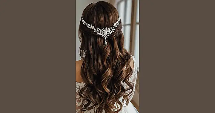 This hairstyle is like when you try to “accidentally” look cute for your crush, but dial it up to eleven for, like, a wedding! You’ve got the gorgeous, flowing waves that say, “Hey, I woke up like this,” but then BAM! That headband comes in, shining brighter than your future together, and screams, “Actually, I spent three hours perfecting this!” It’s the perfect balance of effortless and “I’m totally trying really hard,” which, let’s be honest, is most of us on picture day anyway.