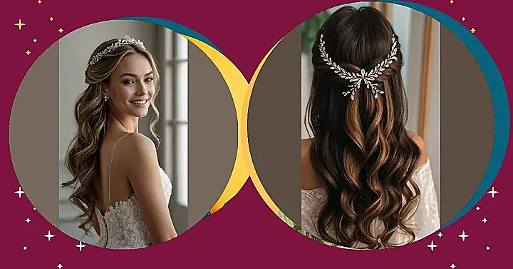 Planning your big day and stressing about the hair? Don’t worry, we’ve all been there staring into the mirror, wondering if we can pull off anything other than a messy bun. This hairstyle is seriously gorgeous and it’s totally achievable! The best part? It’s like a fancy half-updo with waves, a sparkly headband, and a flower all in one. It’s giving off serious fairytale vibes, like you’re about to run off with a prince into the sunset.