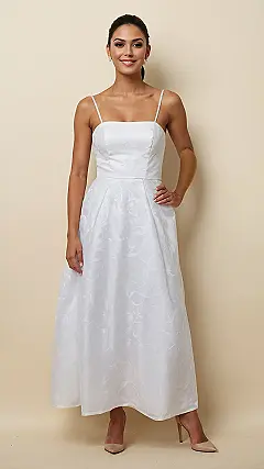 And speaking of comfort meets style, this midi dress isn’t just a pretty face – it’s basically your fashion MVP! You can throw on some cool sneakers with a midi for a chill mall trip, or rock it with heels like our confident friend here for that semi-formal where you want to impress without looking like you tried *too* hard. The white, subtle pattern on this dress adds a touch of “I’m effortlessly chic” without screaming “I spent hours planning this outfit!” It’s the kind of dress that says, “Yes, I know I look good, and no, I didn’t have to wrestle with a complicated zipper for twenty minutes to achieve it.” Pure genius for any event, from a fancy dinner to just feeling fabulous because you can.