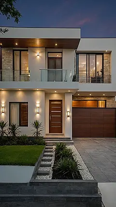 Check out all those cool lights! This house practically gives itself a warm hug with all its glowy bits, making it look super inviting, especially when the sun starts to set. And that front door isn’t just a door; it’s a grand entrance to awesome, guarded by those spiky plants that look like they’re ready to party. Plus, the garage door is so sleek and hidden, it’s practically a secret lair for your family car. Living here, you’d probably feel like a super cool character from a movie, or at least someone whose homework magically does itself because the house is too cool for stress. Your friends would definitely want to hang out here, especially if you told them it had a built-in snack bar… or at least really good Wi-Fi.
