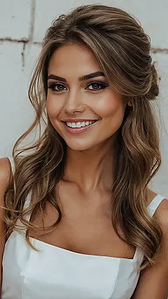 This half-up style is basically a superhero for wedding guests (or even the bride!) at a noon ceremony. It keeps the hair out of your eyes while you watch the ‘I do’s’, stays looking gorgeous when you’re trying to catch the bouquet (or dodge it, let’s be real), and totally nails the whole “effortlessly beautiful” look you were aiming for. Plus, those waves? They’re practically begging for a golden hour photo op, even if it’s still just high noon. It’s all about surviving the happy chaos of a wedding day looking like you just stepped out of a movie scene, not a wind tunnel.
