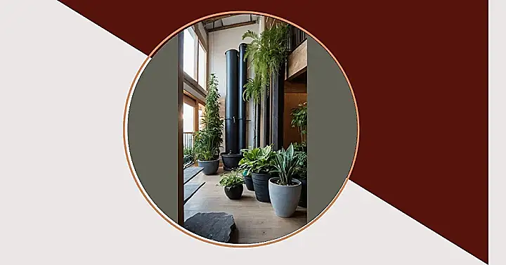 This picture shows an indoor garden that’s like a mini jungle right in your house! Imagine having a little bit of the rainforest right in your living room. There are all these cool plants in pots, and the best part is the water feature! It’s like a tiny stream running through your house!