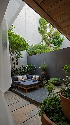 You know those days when your brain feels like it’s been through a blender and you just need a break? Well, picture this green escape! It’s like someone airlifted a mini slice of Italy and dropped it right here, complete with a cool pergola dripping with leaves acting like nature’s best sunshade. There’s a serious-looking tree chilling in a giant pot that looks like it could be a modern art sculpture, just soaking up the sunbeams dappled across the stones. It feels super peaceful, the kind of place you could actually finish reading a book without getting distracted, or at least pretend to while scrolling your phone in style.