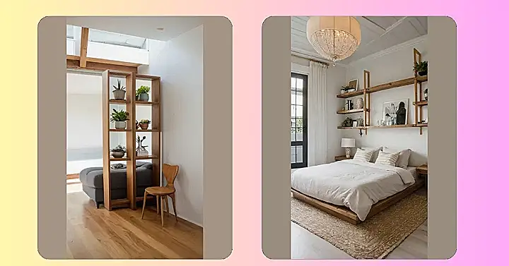 Check out this setup – it’s like a magic trick for making a room feel bigger! Instead of boring old walls, they’ve used a cool bookshelf as a divider. It’s packed with plants, so it’s like a mini-indoor garden that also makes the space feel more open and airy. Plus, who needs a huge couch when you can have a comfy little chaise lounge tucked in behind?