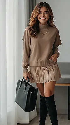 This outfit is like a grown-up version of comfy pajamas! It’s got the soft, cozy sweater and the flowy skirt that makes you feel like you’re wearing a cloud. The boots are super stylish, but let’s be honest, they’re probably also really comfy for those long school days. Plus, you can totally rock this look with your favorite backpack and still be the coolest kid in class. Who needs a uniform when you can look this good?