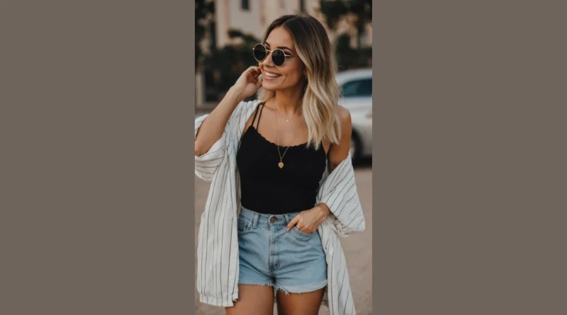 Speaking of summer adventures, this whole tank top outfit situation is basically a masterclass in looking cool without even trying too hard. Those denim shorts look like they’ve been perfectly broken in, ready for anything from a casual stroll to an impromptu dance-off. And let’s not forget those awesome round sunglasses! They’re not just for blocking the sun; they’re also doing double duty as the ultimate “I’m too cool for school, but also really friendly” accessory. It’s like this whole look is whispering, “Yeah, I just woke up, grabbed these awesome pieces, and now I’m ready for whatever fun the day throws at me!” Tank top outfits definitely take the prize for effortless style.